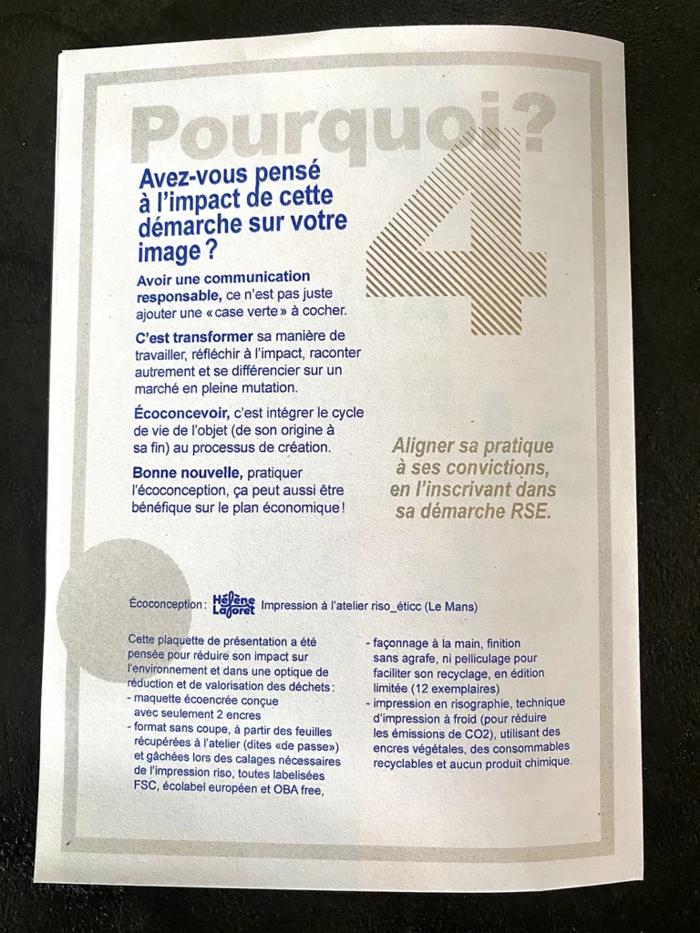 Ces questions vous passionnent ? Moi aussi ! En tant que graphiste, je place au cœur de mon processus de création, les points essentiels de l’écoconception : le choix du papier, l’encre, l’impression et le façonnage, le mode de transport et la fin de vie du produit.