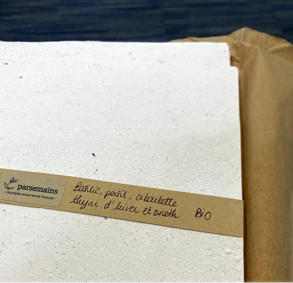 De jolis petits sachets sobres en papier brut certifié PEFC, imprimés en éco-encrage (avec juste assez d’encre pour vous offrir une recette au verso). J’ai utilisé seulement deux tons de couleur et choisi un fournisseur qui travaille avec des encres et des colles à l’eau. Et voilà un article responsable et sage jusqu’à l’emballage.
