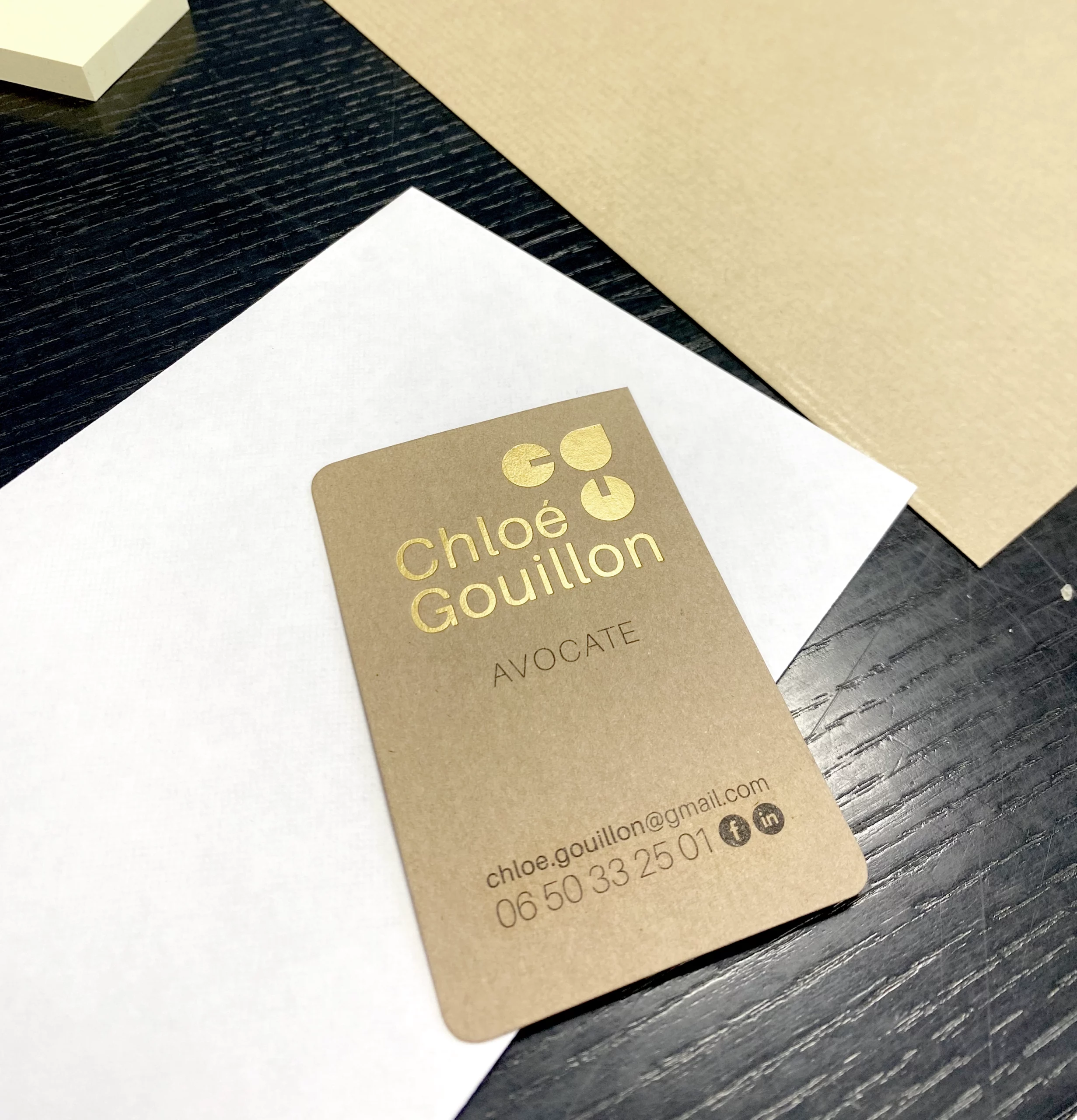 Mon rôle consiste aussi à conseiller sur le choix du support qui accueillera la conception graphique. Le format, les papiers, des encres et des coupes rondes/carrées complètent ici habilement la création pour une carte de visite professionnelle vraiment unique.