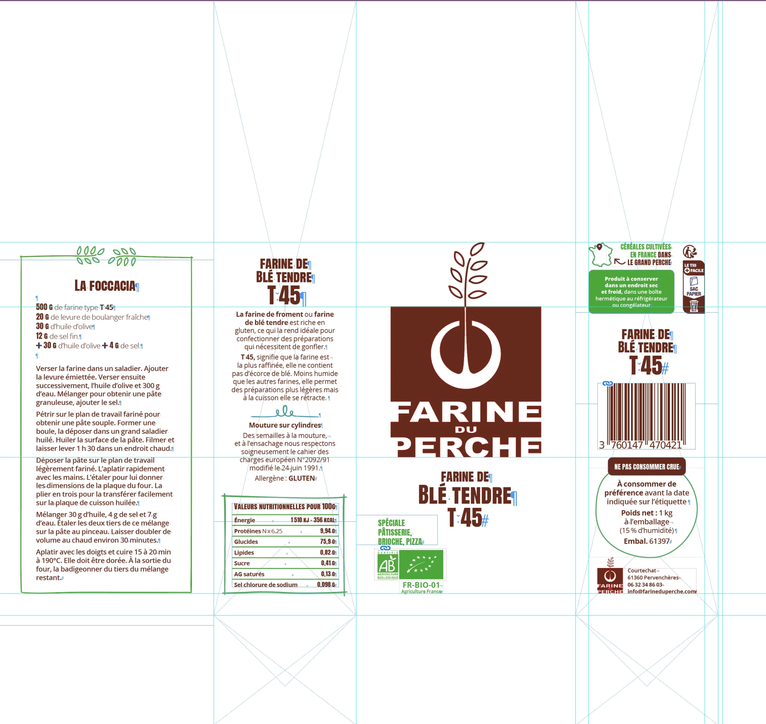 « La farine du Perche », est issue d’un projet collectif. Regroupant 15 producteurs de blé, sous le nom de « producteurs céréaliers du Perche », certifiés en Agriculture biologique. Pour lequel j’ai d’abord créé un flyer original. Leur but étant de produire une farine locale, bio et de qualité. Mon objectif était alors de créer un dépliant promotionnel, mettant en avant leur travail et leurs valeurs.