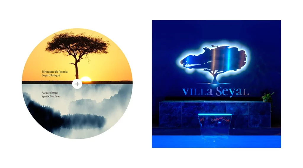 La Villa Seyal est une location haut de gamme au Mans, avec piscine et espace bien-être, proposée par un couple amoureux de l’Afrique. Ma mission : concevoir une identité visuelle originale. Les clients ont opté pour la piste où j’ai utilisé la silhouette caractéristique de l’acacia d’Afrique comme emblème. Un traitement à l’aquarelle fluide signifie la présence de l’eau, qui fait toute la personnalité du lieu. L’ensemble, associé à une typo élégante donne un signe à la fois distingué, évocateur et mémorable, décliné sur l’ensemble des supports.