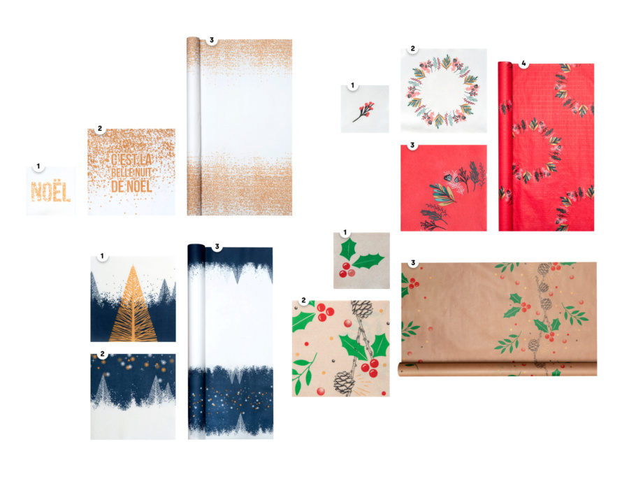 Pour la réalisation de ces produits j’ai donc choisi d’utiliser des couleurs et des motifs symbolisant les fêtes de fin d’année, tout en ajoutant une touche de modernité. Ainsi ces 5 gammes sont très différentes des unes des autres, et peuvent viser un large public. Il y en a pour tous les goûts, que ce soit au niveau des motifs ou des couleurs.
