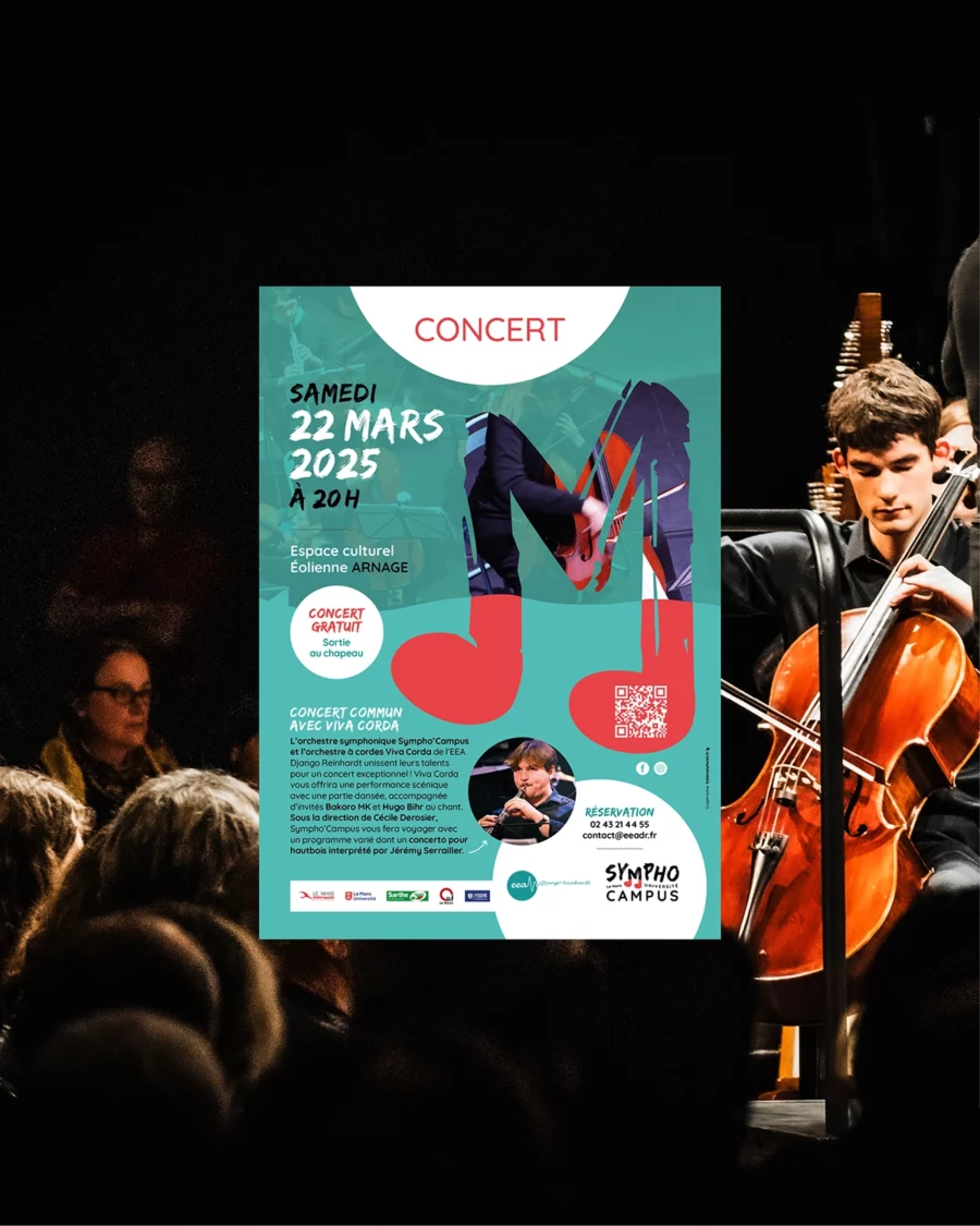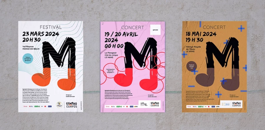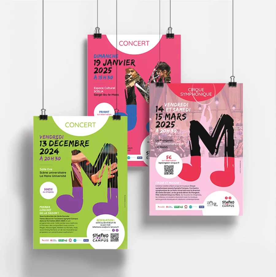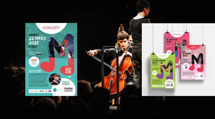 Sympho’Campus est l’orchestre symphonique de l’Université du Maine, au Mans. Étudiants, chercheurs, enseignants, personnels : ils sont 60, tous amateurs, à se produire plus de 6 fois par an, sous la baguette de Cécile Derosier, chef d’orchestre. Pour annoncer ses spectacles, l’ensemble avait besoin d’un visuel fort à apposer sur les flyers concert et affiches. J’ai conçu une identité graphique déclinable, reproductible pour chaque événement. Je vous explique comment.