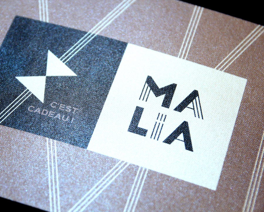 Concernant le logo nous avons opté pour une forme carrée. Ce qui lui procure un bon rendement de lecture en petit, et un impact rappelant celui des poinçons ou des tampons. La finesse de certaines lignes (rappelant les cheveux bien peignés !) confrontée à celles épaisses apporte une touche très graphique et contrastée. La simplicité des lettres construites avec des formes géométriques apportent un côté ethnique qui s’accorde bien et de façon subtile avec les consonances grecques du nom Malia.