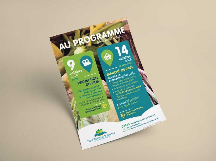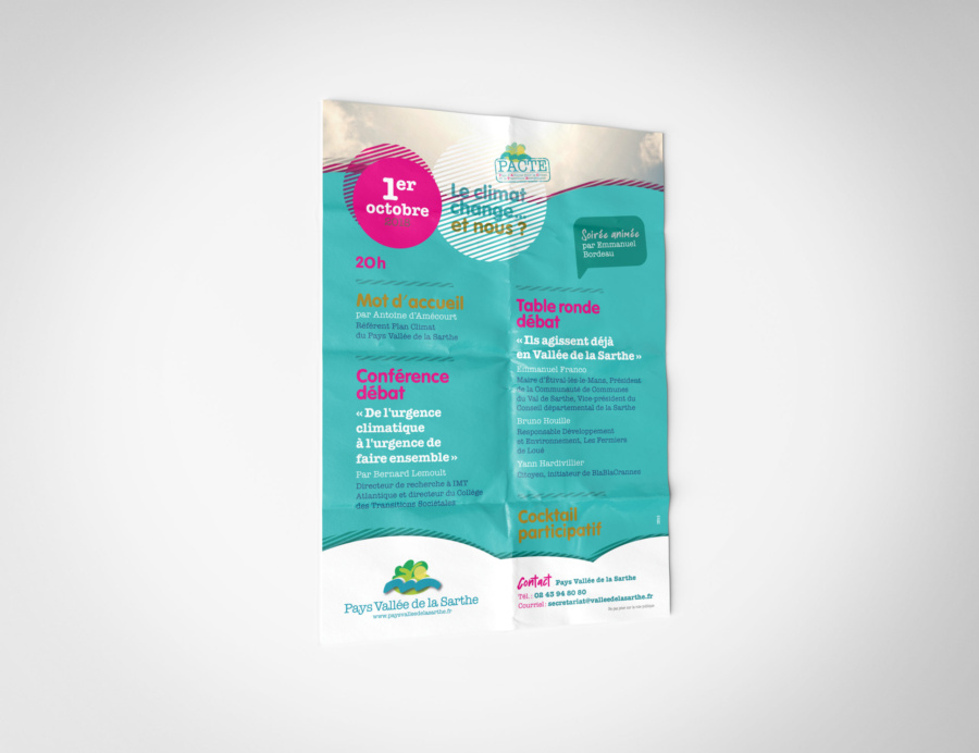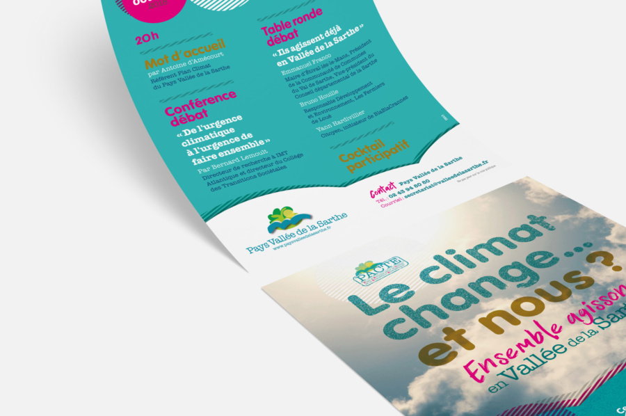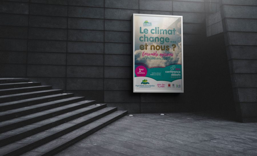 Le Pays Vallée de la Sarthe, pour qui j’ai également réalisé une brochure, fait appel à moi en 2018 pour créer les supports de communication de deux événements importants. Le premier est une campagne « Le Climat change… et nous ? ». Il s’agit de s’adresser à toute la population du Pays, via des affiches sur l’espace public par exemple, pour les inviter à participer à une journée de réflexion et de débat. Le message doit être clair, le ton convivial, le tout engageant.