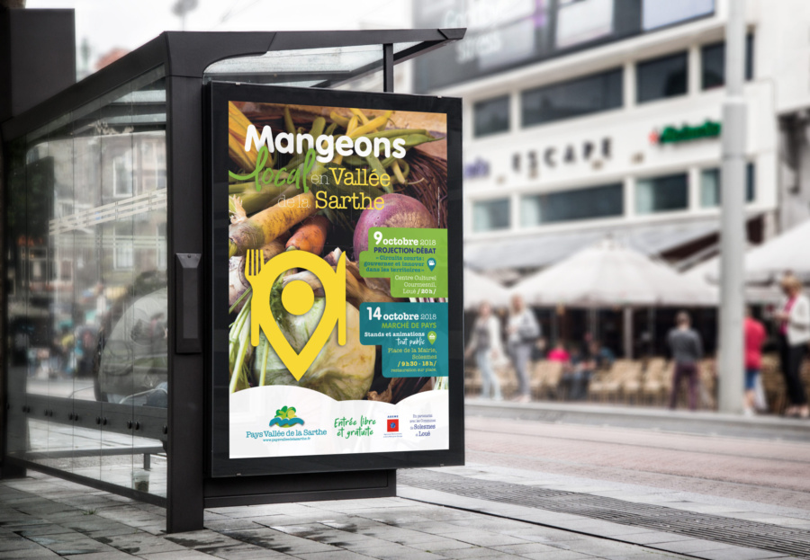 Le second temps fort est organisé autour du « manger local »avec une projection-débat et un marché de pays à la découverte des producteurs du territoire. Pour cet événement justement, j’ai imaginé de fusionner deux pictogrammes qui font désormais partie de notre univers “numérique” celui de la géolocalisation, la fameuse « goutte-épingle » et des couverts stylisés. Simple, efficace : c’est la transcription visuelle de la phrase « ici on mange local ». Il a servi de fil conducteur sur tous les supports, du flyer à l’affiche.